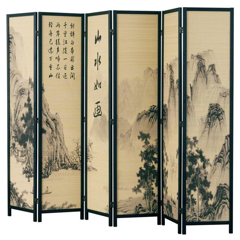 Siyah Masif Çam Ahşap ve Bambu 6 Panelli Katlanır Manzara Baskılı Paravan – 241×176 cm – 184652