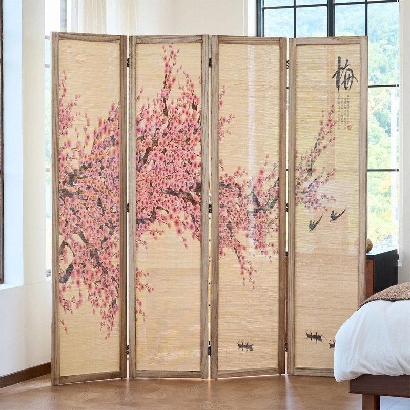 Çift Taraflı Baskılı Erik Çiçeği Desenli Bambu ve Paulownia Ahşap 4 Panelli Paravan – 170×163 cm – 184740