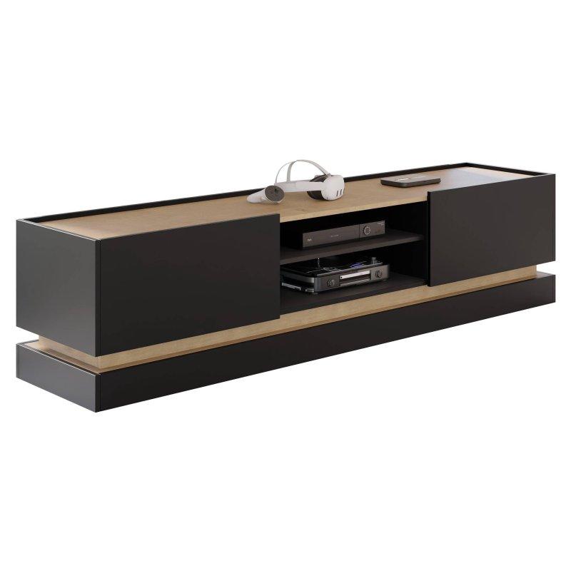 Tasarımı, açık ahşap tonuyla siyah renkli kapaklı bölümlerin kombinasyonundan oluşur. Üst yüzey açık ahşap rengiyle mat bir dokuya sahiptir. Yan bölümler ve kapaklar ise mat siyah renkle tasarlanmıştır. Bu renk uyumu, modern ve dengeli bir görünüm oluşturur. Ünitede bulunan açık raflı bölüm, TV ve cihazlarınızı sergilemek için ideal bir alan sunar.