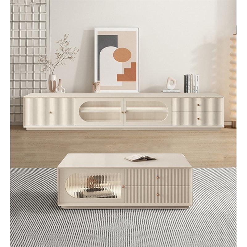 Yüksek kaliteli endüstriyel ahşap ve çok katmanlı malzeme ile üretilen bu takım, oturma odanızın depolama ihtiyaçlarını karşılamak için tasarlanmıştır. TV ünitesi ve orta sehpa, açık krem renginde ve mat yüzeye sahiptir. Mat doku, ışığı yumuşak bir şekilde yansıtarak rahat bir görünüm oluşturur.