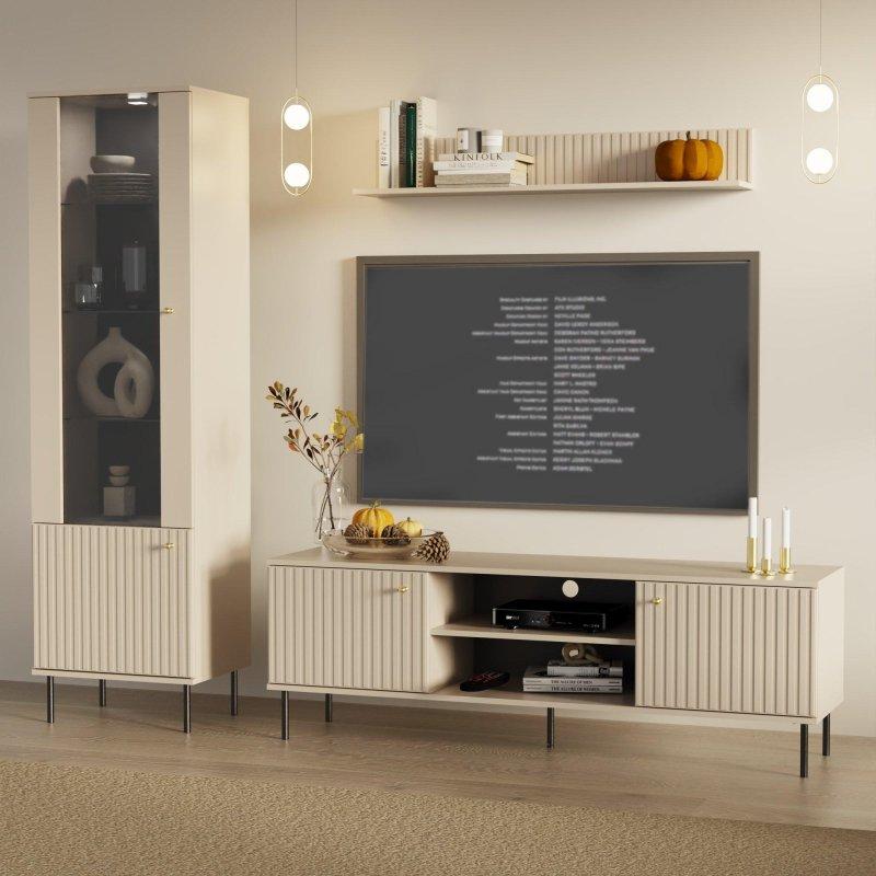 Vitrinin iki kapısı, içeriğe kolay erişim imkanı tanır. Cam paneller sayesinde içerideki eşyalar dışarıdan görülebilir. Ürün, TV’nin altında veya yanında yerleştirilmek üzere tasarlanmıştır.