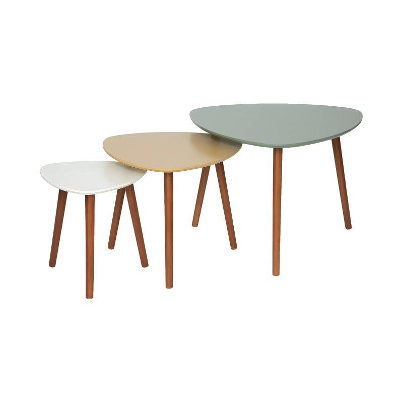 Bu üçlü zigon sehpa seti bej renkte bir tasarıma sahiptir. Üç farklı boyutta masa içeren set, farklı kullanım alanları sunar ve mekanınızda pratik çözümler sağlar.