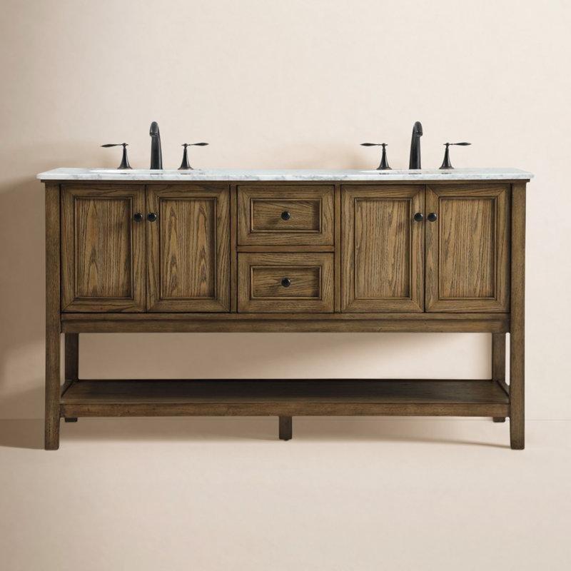 • Gövdesi masif ahşap, kontrplak ve endüstriyel ahşap malzemelerin birleşimiyle üretilmiş olup, üzerinde eğimli kenarlara sahip beyaz ve gri damarlı Carrara mermer tezgah yer alır.