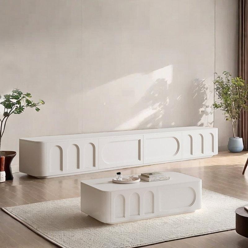 Bu ürün seti, yüksek kaliteli katmanlı ahşap malzemeden üretilmiştir. Beyaz renkte tasarlanmış olup, mat ve pürüzsüz bir yüzeye sahiptir. Tasarımda minimalist ve modern bir anlayış hakim olup, oturma odalarına temiz ve düzenli bir görünüm kazandırır.