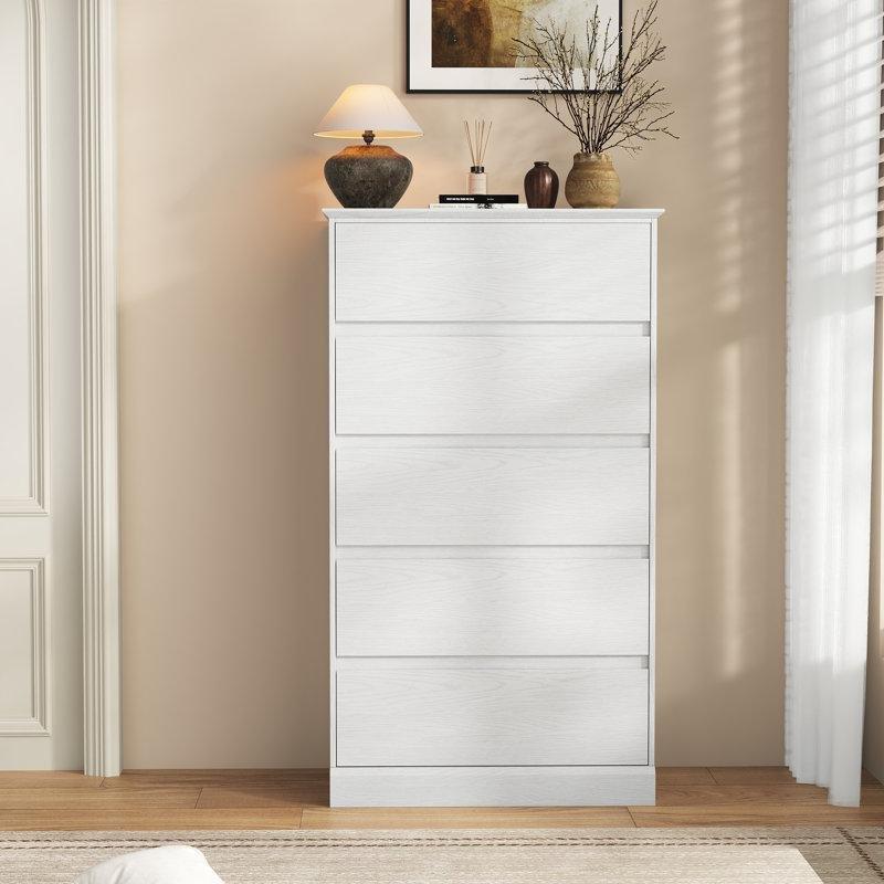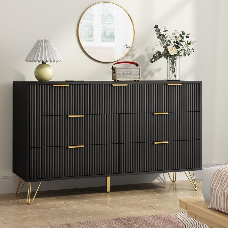 • Beyazın ferahlığını gold detayların zarafetiyle buluşturan bu şifonyer, dikey oluklu ön panel tasarımıyla yaşam alanlarına derinlik ve modern bir atmosfer kazandırır.