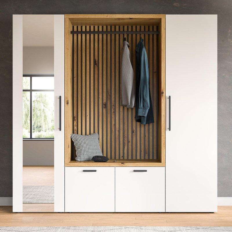 • Bu üç parçalı set, bir gardırop paneli, bir ayna ve iki çekmeceli bir banktan oluşarak antreniz için komple bir çözüm sunar.
