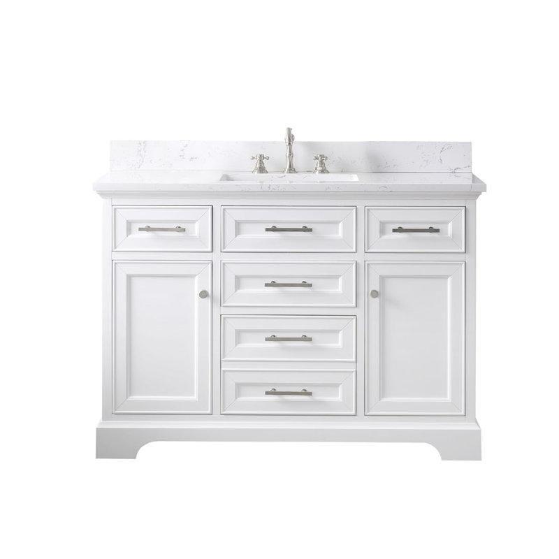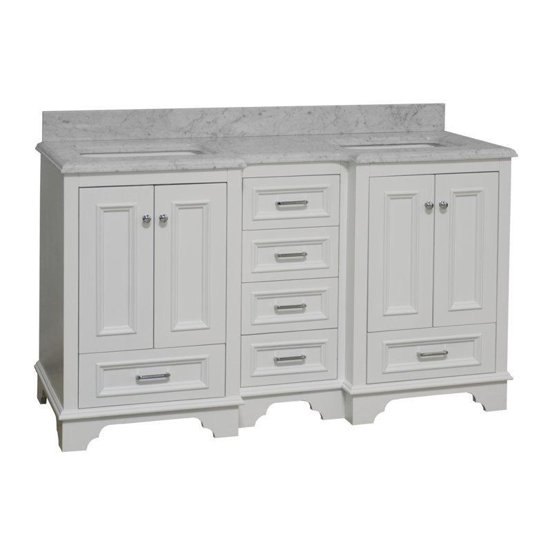 • Beyaz kültür mermeri tezgah, tezgah altı montajlı iki adet kare seramik lavabo ile tamamlanmıştır. Tezgah, tek delikli batarya montajı için hazırlanmıştır.