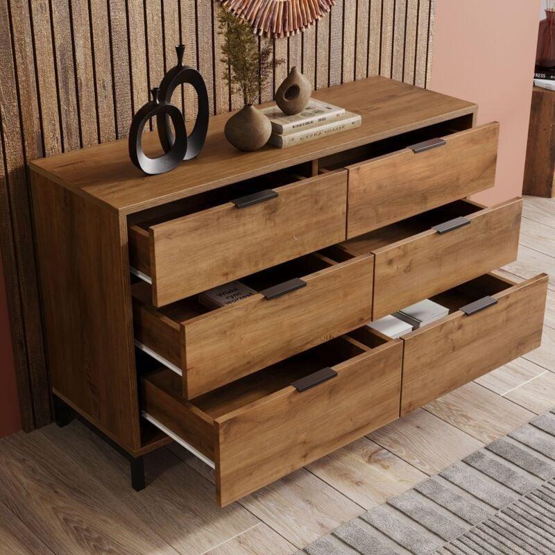 • Her biri 63 cm genişliğe ve 34 cm derinliğe sahip altı adet geniş çekmece, kıyafetlerden evraklarınıza kadar pek çok eşyayı düzenli bir şekilde muhafaza eder.
