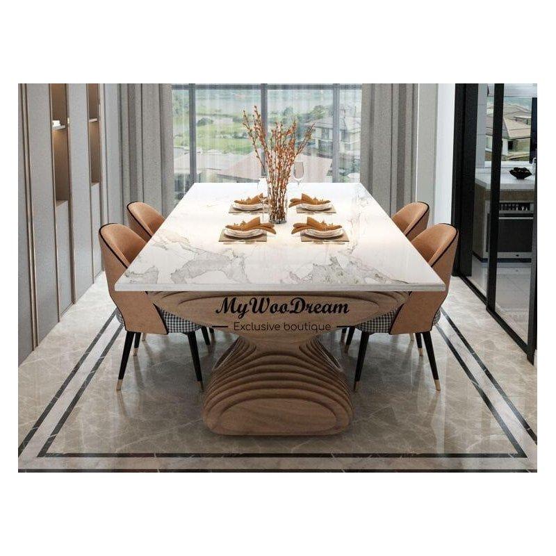 Bu yuvarlak mermer masa, beyaz damarlı mermer tablası ve oymalı ceviz kaidesi ile doğanın dengesini yansıtan bir tasarıma sahiptir. 152 cm çapındaki geniş tabla, 4 ila 6 kişinin rahatça oturabileceği bir yemek alanı sunar.