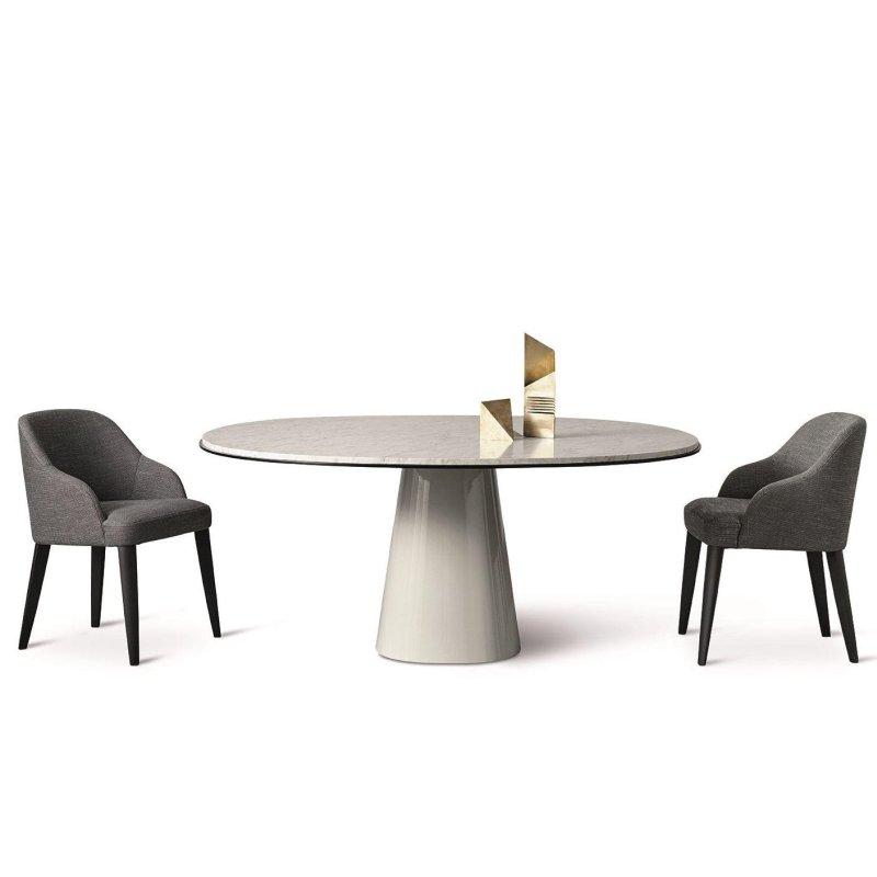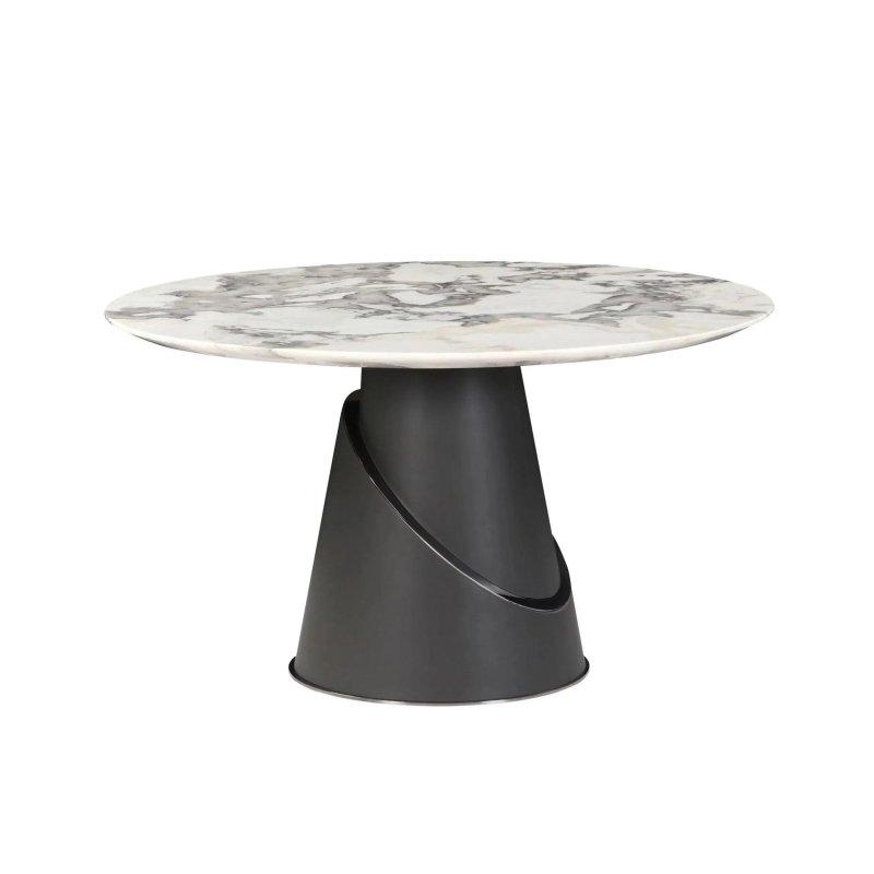 Beyaz damarlı mermer tabla, ince taş görünümü yaratan ters eğimli kenar detayı ile dikkat çeker. Bu özel kesim sayesinde tabla, konik kaide üzerinde hafif ve zarif durur. Mermer yüzeyi doğal damar desenlerine sahiptir ve her masa kendine özgü bir görünüm taşır.