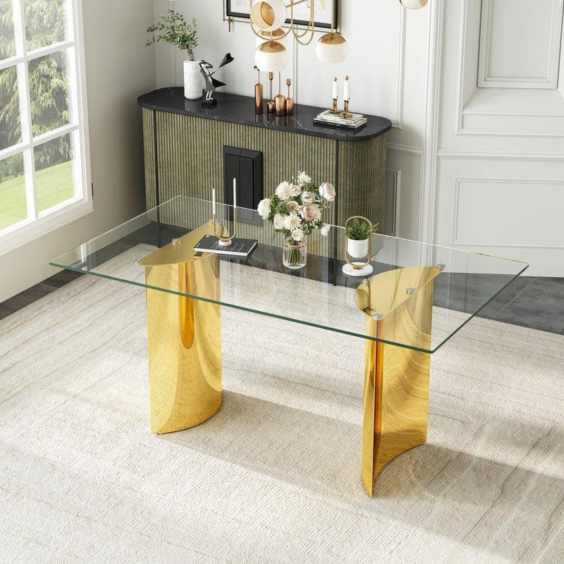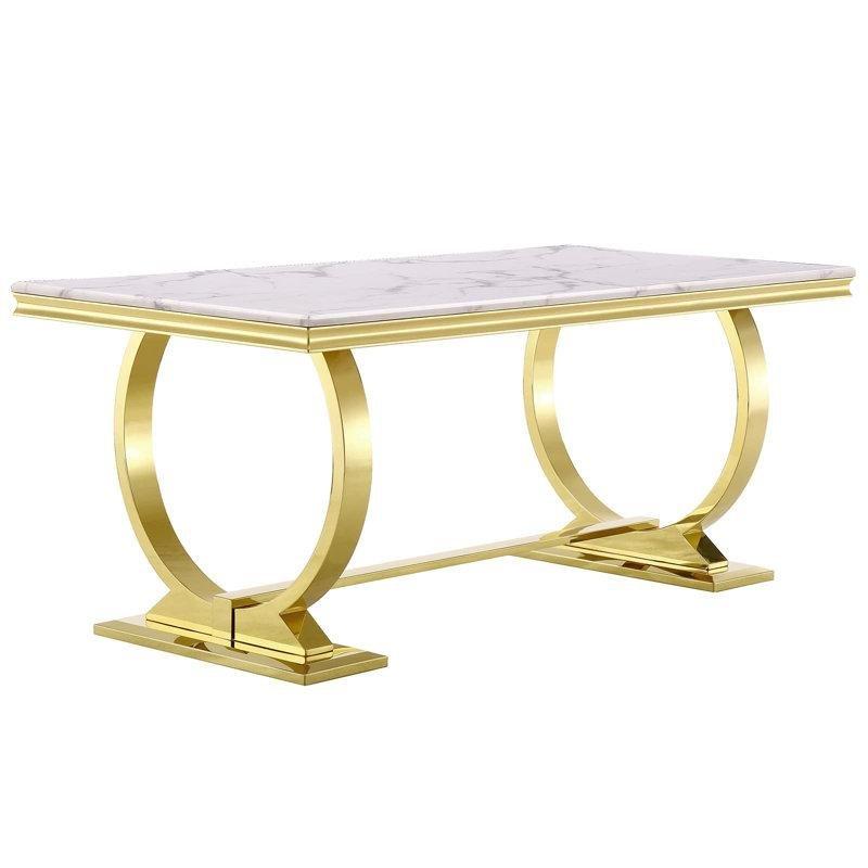 Masanın çift pedestal tabanı paslanmaz çelikten yapılmıştır. Yarım dairesel şekildeki bu tabanlar, eğri ve organik bir tasarıma sahiptir. Paslanmaz çelik, gümüş renginde ve parlak bir yüzeye sahip olup, masaya şık ve görkemli bir görünüm katar. Metal tabanlar oldukça dayanıklı ve uzun yıllar boyunca kalitesini korur.