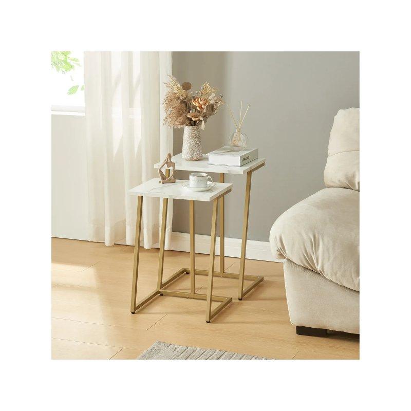Bu ikili zigon sehpa takımı beyaz ve siyah mermer desenli tablası ile modern bir tasarıma sahiptir. Farklı boyutlarda iki sehpa bir arada kullanılabileceği gibi ayrı odalarda da kullanılabilir. Metal ayakları çarpraz tasarımlıdır ve sağlam bir yapı sunar.