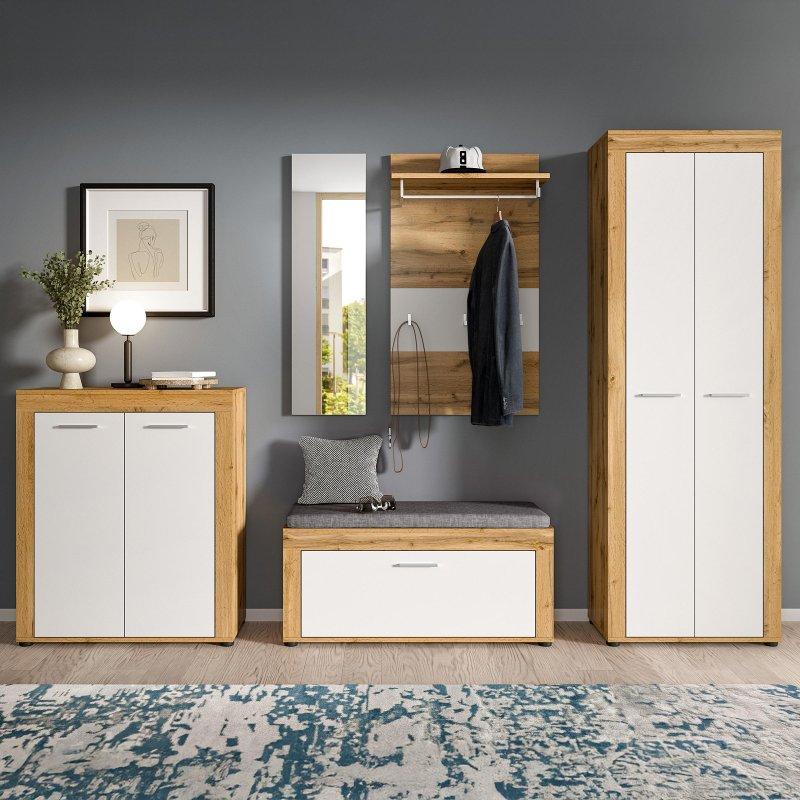 • Modern ve işlevsel bir antre için tasarlanan Danti portmanto seti, beyaz ve Wotan meşe dekor renklerinin uyumlu birleşiminden oluşur.