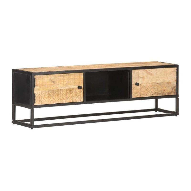 Sehpanın gövdesi iki ayrı ahşap kapaklı ve bir açık raftan oluşuyor. Siyah metal çerçeve, ağacın doğal tonlarıyla mükemmel bir kontrast oluşturuyor. Ahşap kapaklar, el işçiliği desenlerle zenginleştirilmiş ve her parçanın benzersiz görünmesini sağlamış.
