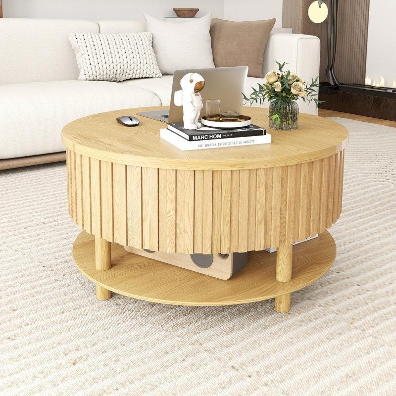 Bu yuvarlak akıllı sehpa, yaşam alanınızda işlevsellik ve tasarımı bir arada sunuyor. Yüzeyde yer alan üç boyutlu silindirik dokular, dikkatli bir şekilde oyulmuş sanat çizgileri gibi görünüyor ve sıcak ahşap tonu doğal bir yumuşak atmosfer yaratıyor.