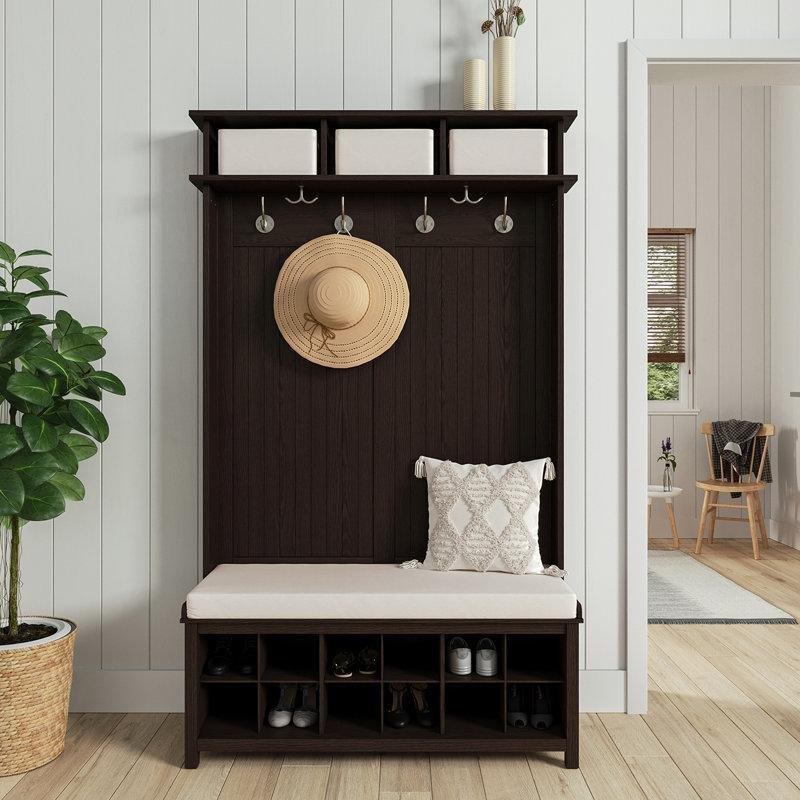 • Antrenizi düzenlemek için tasarlanan bu 3’ü 1 arada portmanto, oturma bankı, ayakkabılık ve askılık özelliklerini tek bir mobilyada birleştirir.