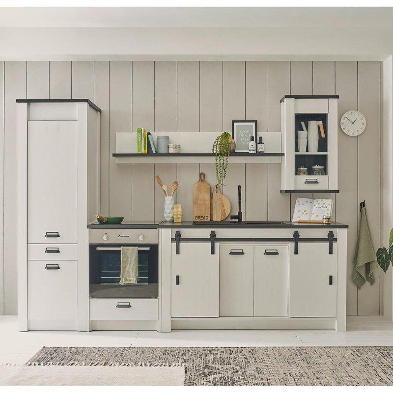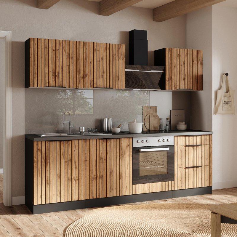 • Set içerisinde 1 adet evye altı dolabı, 1 adet bulaşık makinesi kapağı, evye dolabı için 1 adet tezgah, 1 adet çekmeceli dolap, 1 adet raf, ada için 1 adet tezgah, 1 adet fırın dolabı, 1 adet buzdolabı dolabı, 4 adet duvar dolabı ve 1 adet duvar rafı yer alır.