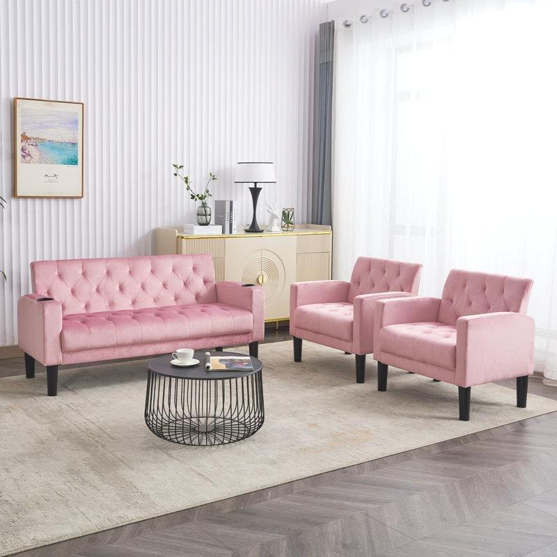 • Bu koltuk takımı, bir adet üçlü koltuk ve bir adet tekli berjerden oluşur; kadife kumaş döşemesi ile modern ve çağdaş yaşam alanlarına uyum sağlar.