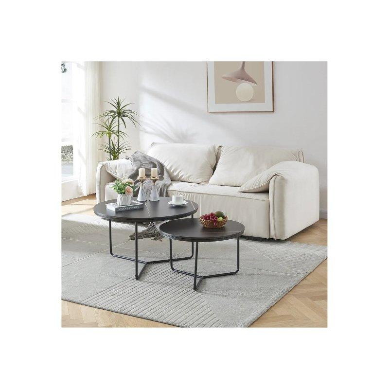 Sehpaların üst yüzeyi yonga levhadan üretilmiştir ve üzerinde mermer desenli melamin kaplama bulunur. Bu kaplama sayesinde yüzey çizilmelere karşı dayanıklıdır ve günlük kullanımda kolayca temizlenebilir. Ayaklar siyah metal malzemeden yapılmıştır ve geometrik tel tasarımı modern bir görünüm sunar.