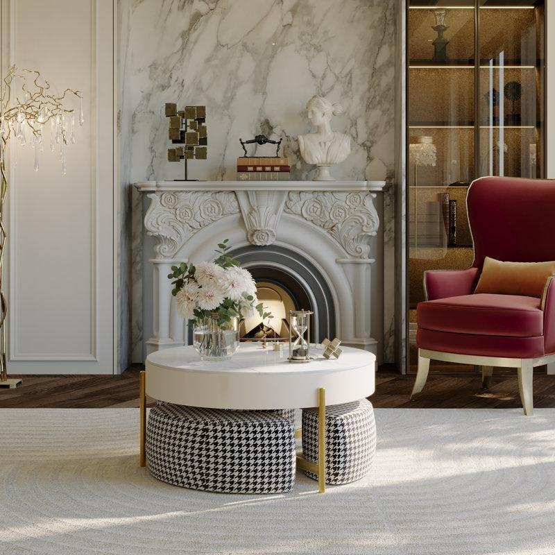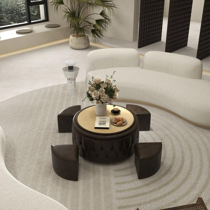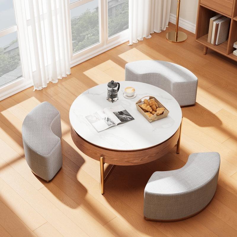 Orrta sehpanın en önemli özelliği, altına sığan dört adet polsterlü saklama pufudur. Bu puflar gerekli olmadığında sehpanın altına yerleştirilerek yer tasarrufu sağlar. Aynı zamanda ilave oturma yeri veya ayaklık olarak kullanılabilirler. Her pufun içinde eşya saklama alanı bulunur, bu da işlevselliği artırır.