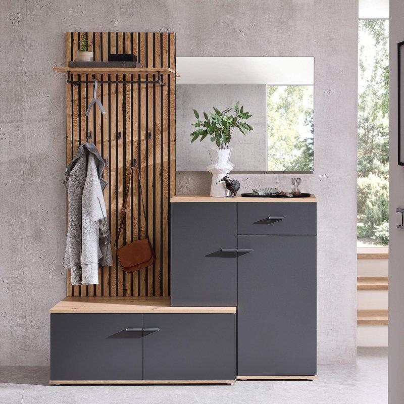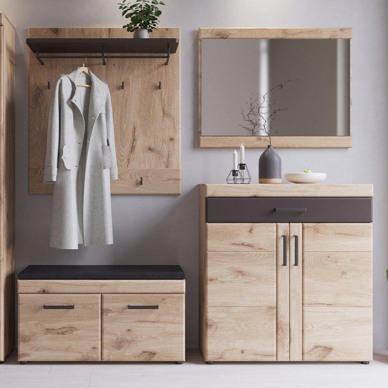 • Bu kompakt set; bir bank, bir şifonyer, bir ayna ve bir askılık panelinden oluşarak antreniz için bütüncül bir çözüm oluşturur.