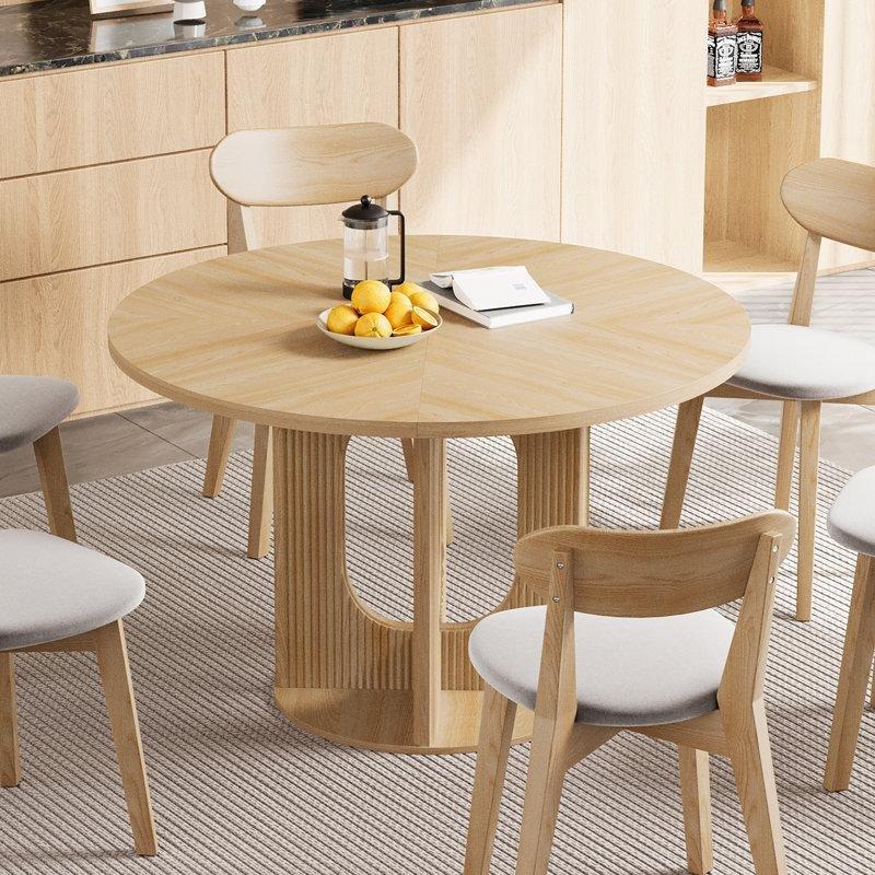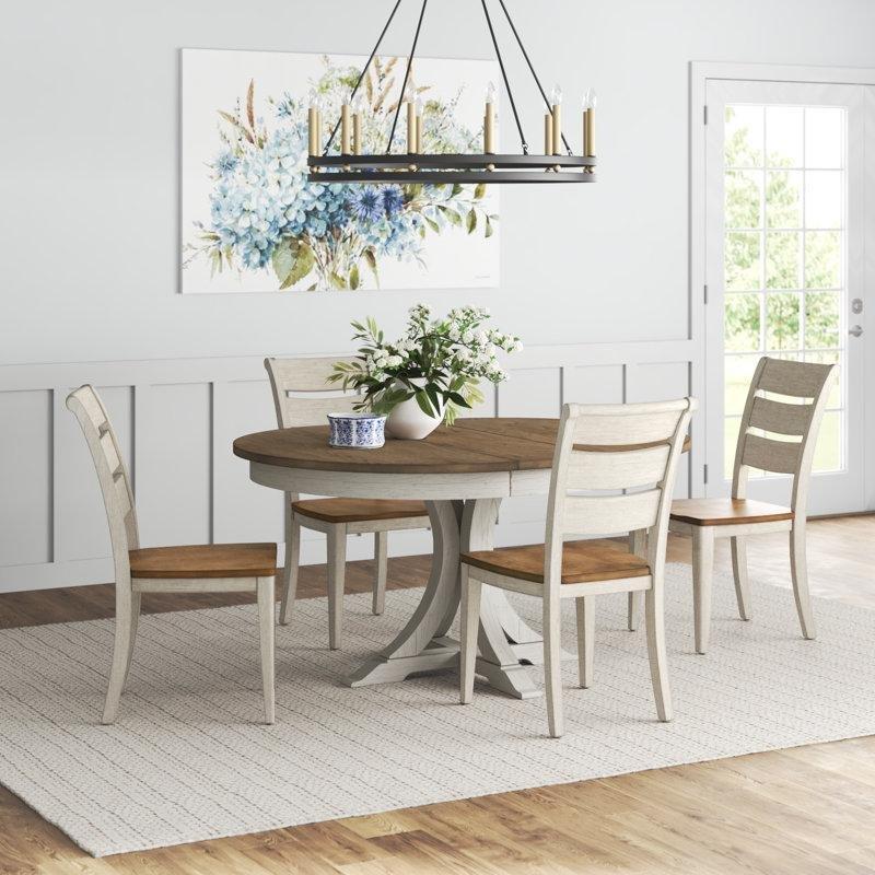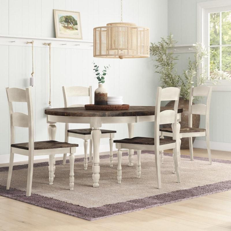 Bu 5 parçalı mutfak yemek masası seti, Fransız kırsal tasarımını evinize getiriyor. Sette yuvarlak ayaklı bir masa ve dört adet sandalye bulunuyor. Tüm parçalar masif ve endüstriyel ahşaptan yapılmıştır. Ahşap taneleri daha doğal bir görünüm vermesi için kasıtlı olarak aşındırılmıştır.