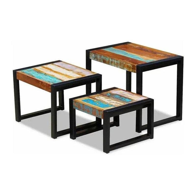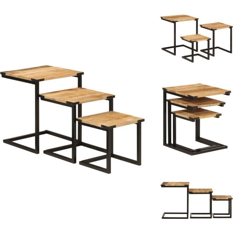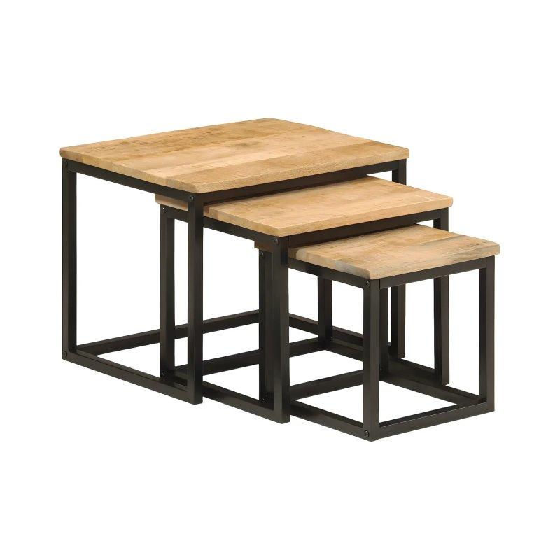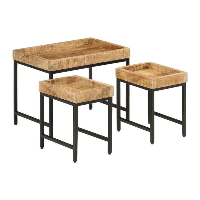 Bu üçlü zigon sehpa seti, masif mango ahşabı ve metal ayaklarıyla sağlam bir yapıya sahiptir. Ham ahşap yüzeyi doğal renk tonlarında olup her ürünün kendine özgü ahşap damarları bulunur. Metal ayaklar siyah renkte olup ahşap tablayı destekler.