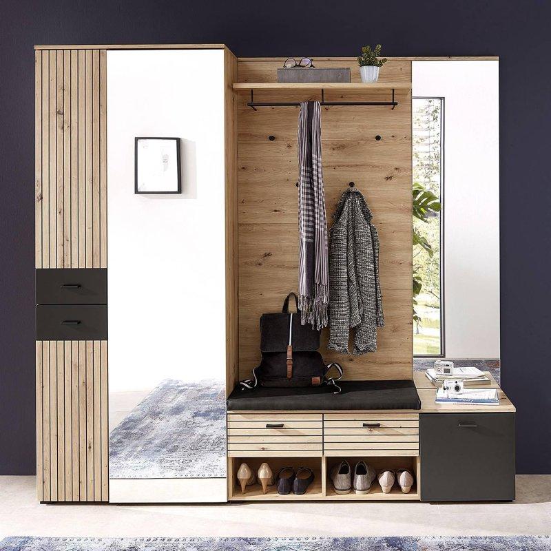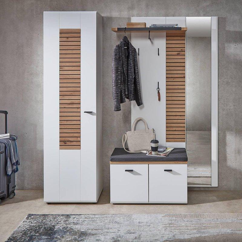 • Set; bir dolap, askılı duvar paneli, oturma minderli bir bank, bir ayna ve bir komodinden meydana gelir.