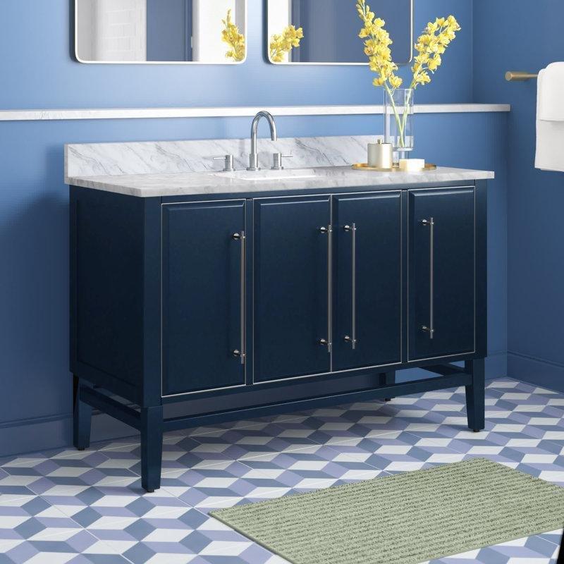 • Fırçalanmış gold metal kulplar, dolabın mavi rengiyle uyum içinde modern bir dokunuş ekler.