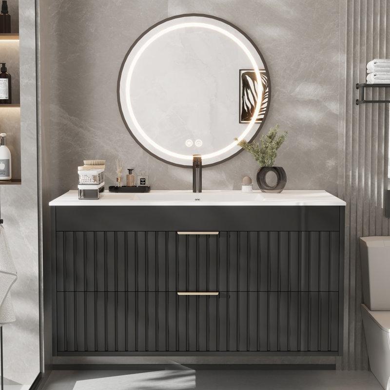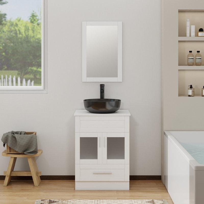 • Set, dolabın rengiyle uyumlu çerçeveye sahip kare bir duvar aynası içerir, bu da banyonuzda bütüncül bir estetik yaratmanıza yardımcı olur.