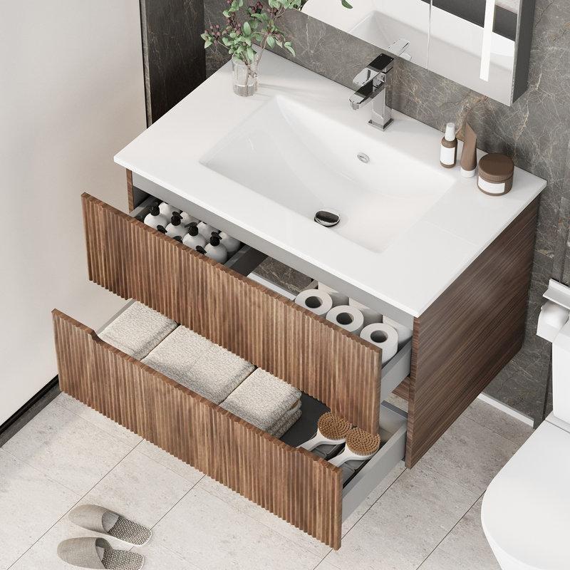 • Bu banyo dolabı seti, neme karşı dayanıklı masif kavak ağacı ve endüstriyel ahşap gövdesi, beyaz endüstriyel mermer tezgahı ve seramik lavabosu ile banyonuza hem işlevsellik hem de estetik bir dokunuş katar.