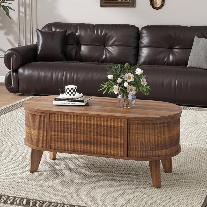 Bu oval akıllı sehpa, modern tasarım ve pratik işlevselliği bir araya getiriyor. Üstü beyaz mermersi malzeme ile kaplanmış, altı ise bej tonunda döşemeli metal ayaklarla destekleniyor. Sehpanın en önemli özelliği açılır mekanizması ile gizli depolama alanı sunması. Dergiler, kumanda ve ev eşyalarını kolayca saklayabilir, oturma odanızı düzenli tutabilirsiniz.