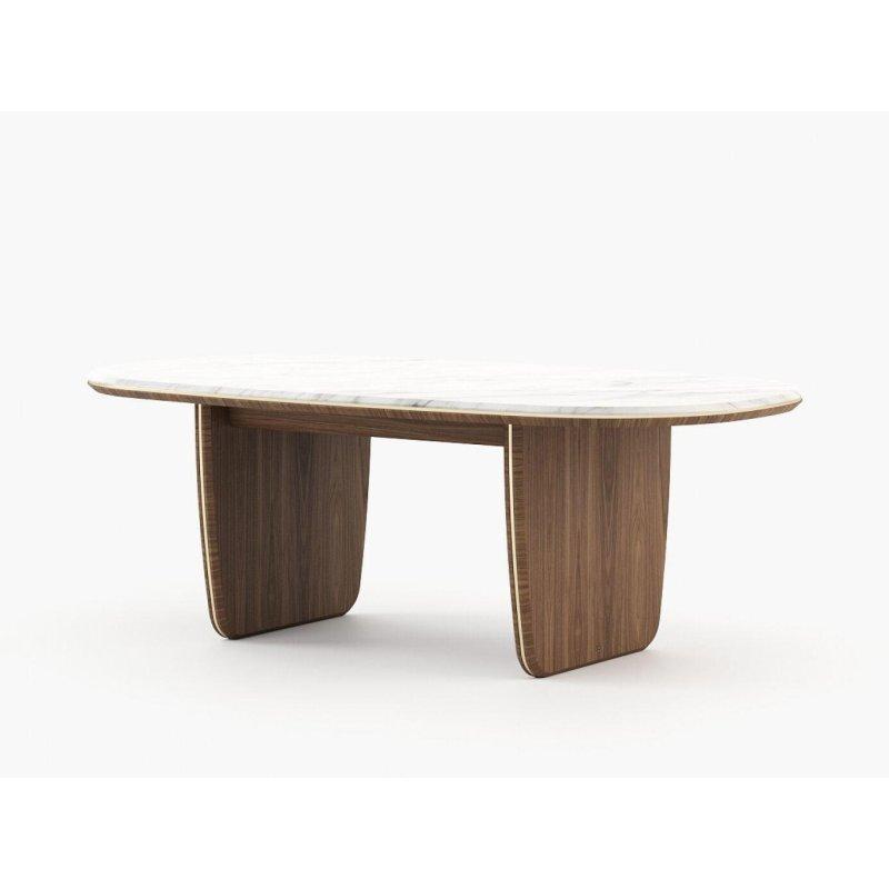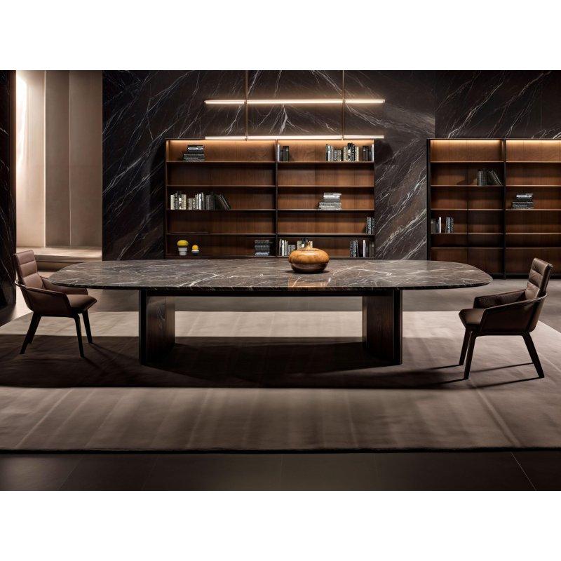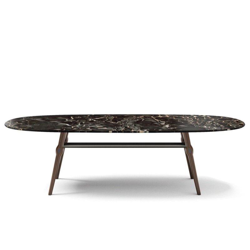 Oval mermer tabla, pah kırılmış profil detayıyla zarif bir tasarıma sahip. Mermer seçenekleri koleksiyondan belirlenebiliyor ve farklı damarlarda tablalar kullanılabiliyor. Tablalı kenarların pah işlemi, masaya modern bir hava katıyor.