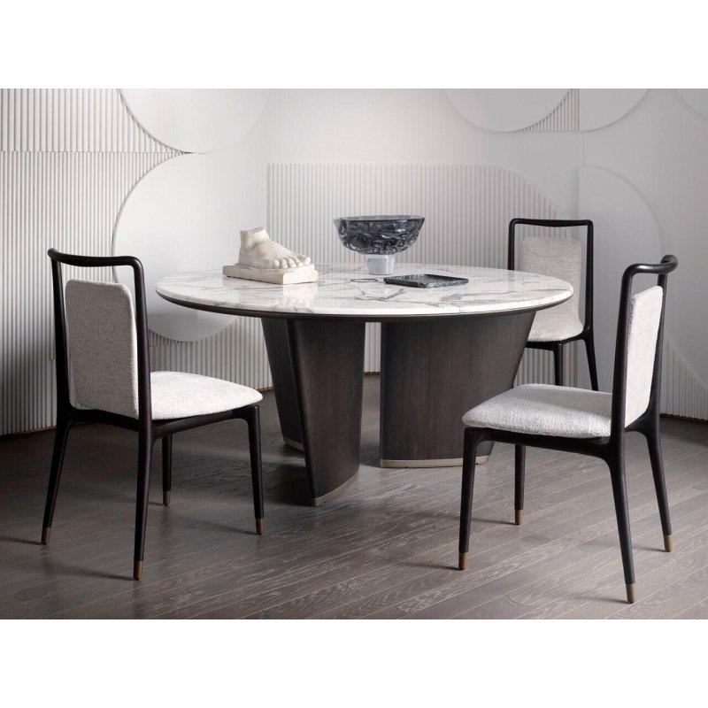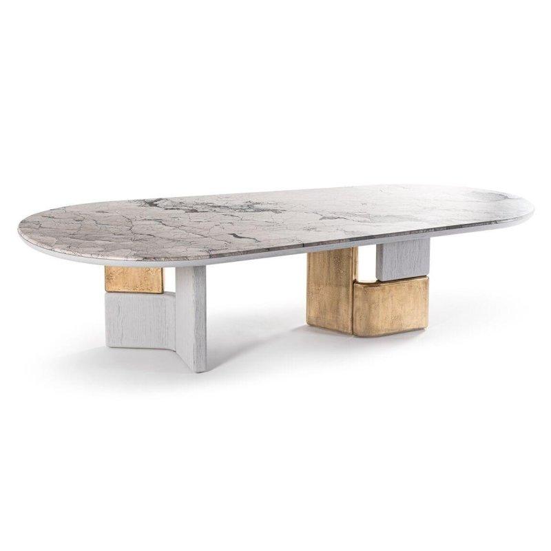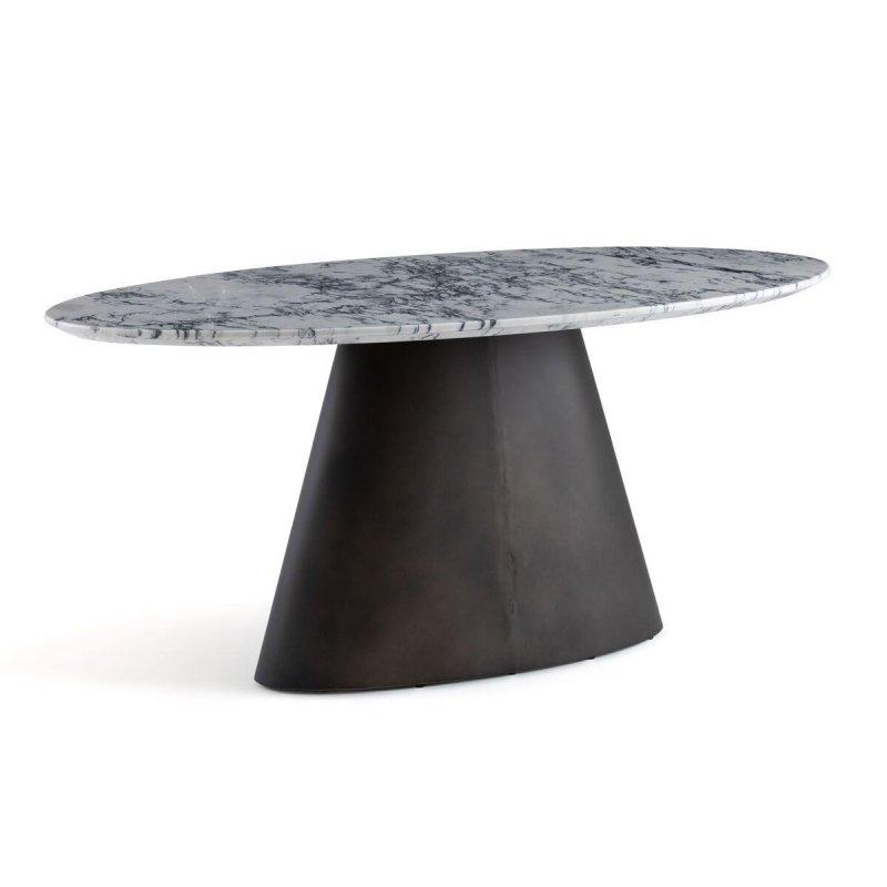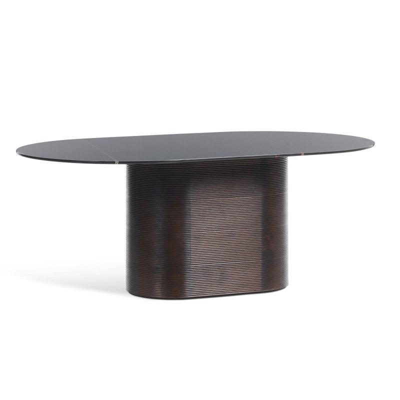 Bu oval mermer masa, yemek odasının merkezi oluşturmak için tasarlandı. Patine bronz rengi ahşap ayağı, yoğun bir şekilde dizilmiş keskin açılarla çevrelenmiş ve yıldız şeklinde bir etki yaratıyor. Monolit yapısıyla dikkat çeken ayak, güçlü ve sanatsal bir görüntüye sahip.