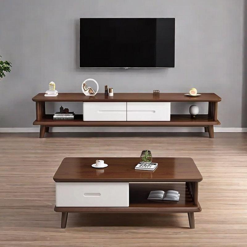 Takım, sıcak kahverengi ve beyaz renklerinin birleşimiyle oluşturulmuştur. TV ünitesinin üst yüzeyi mat kahverengi ahşap tasarıma sahiptir. Alt bölümlerde beyaz renk kullanılmıştır. Orta sehpa da aynı renk uyumunu takip eder. Yüzeyler pürüzsüz ve doğal ahşap dokusunu yansıtır. Parlak olmayan mat bir görünüme sahiptir. Bu tasarım, modern ve klasik iç mekan tarzlarıyla uyumludur.