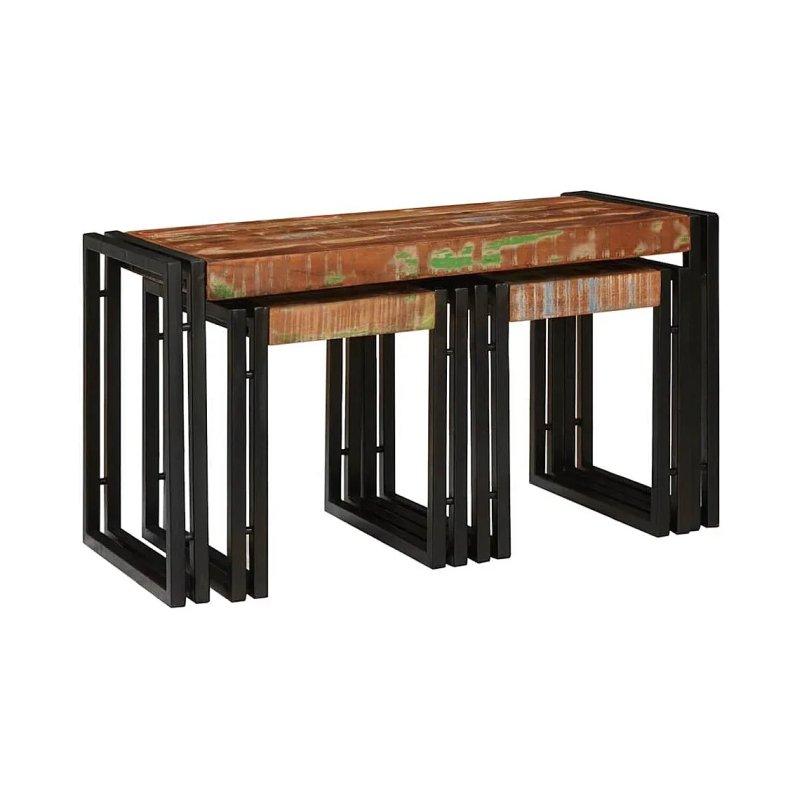 Bu üçlü zigon sehpa takımı rustik ahşap desenli yüzey ve siyah metal ayakları ile dikkat çeker. Kahverengi ahşap görünümü ve siyah çelik ayakları endüstriyel tarzda bir tasarım sunar.
