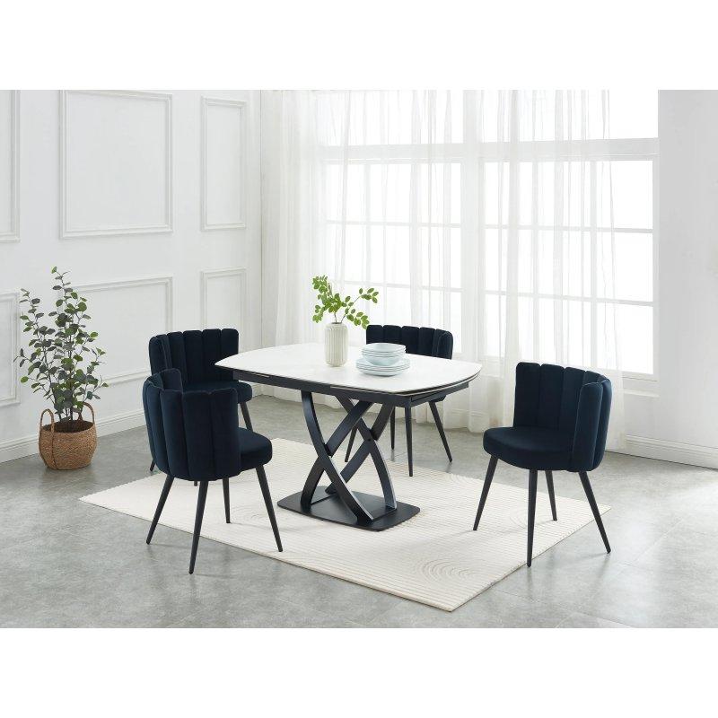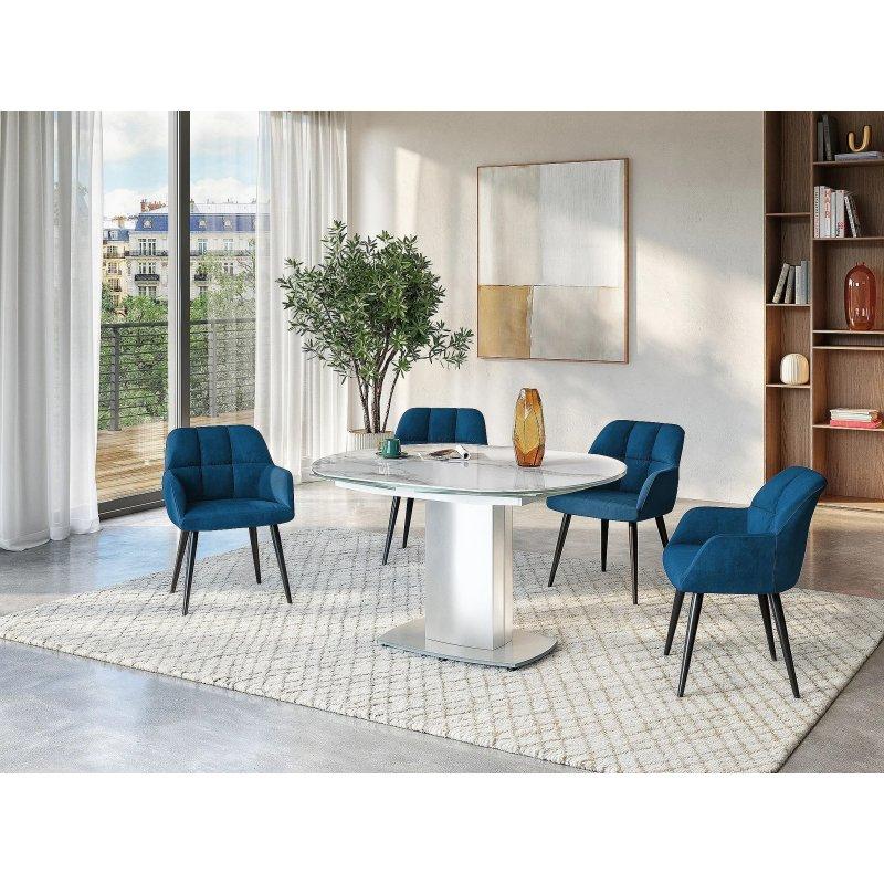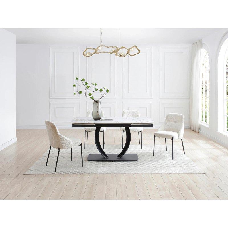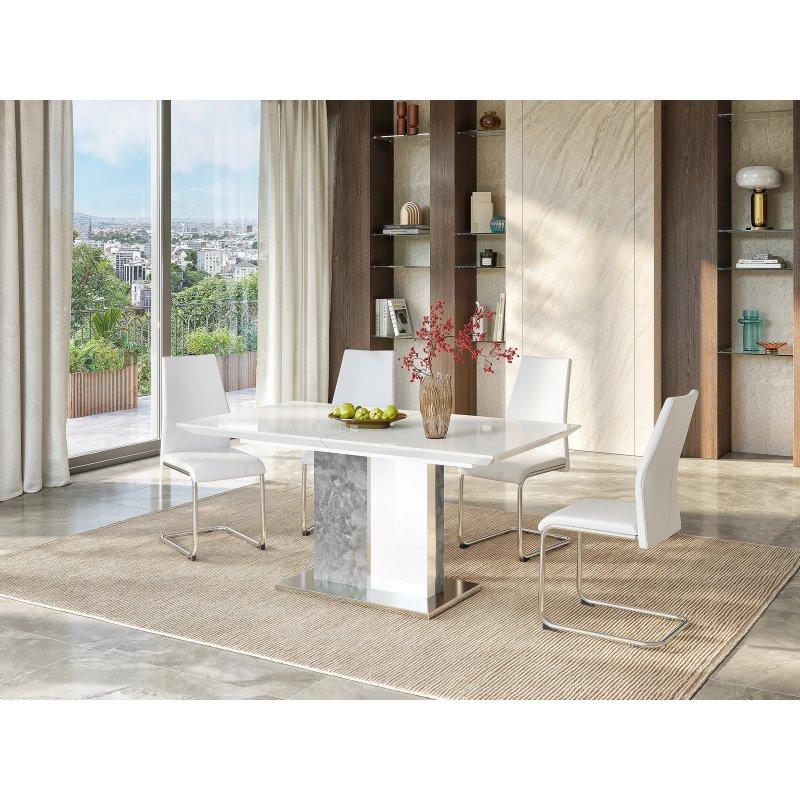 Seramik plateau üzerine temperli cam ve bronz renkli metal ayak ile tasarlanan bu açılır yemek masası, 6 ile 10 kişiye kadar oturma imkanı sunar. Masanın üst yüzeyi beyaz ve gri mermer efektine sahiptir. Bu tasarım, doğal taş görünümünü yansıtan benzersiz tonlama ile oluşturulmuştur.