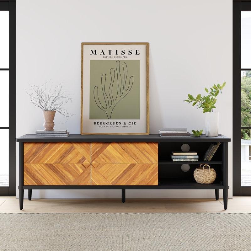 Ürünün en dikkat çekici özelliği, elmas desenli şevron kapılarıdır. Bu kapılar düzgün bir şekilde açılıp kapanır ve medya cihazlarınızı görmek istemediğiniz zamanlarda gizler. Kapıların altında açık raflar bulunur ve bu raflar hareket ettirilebilir olduğundan, hoparlörler, oyun konsolları veya dekoratif eşyalarınız için yer ayarlayabilirsiniz.