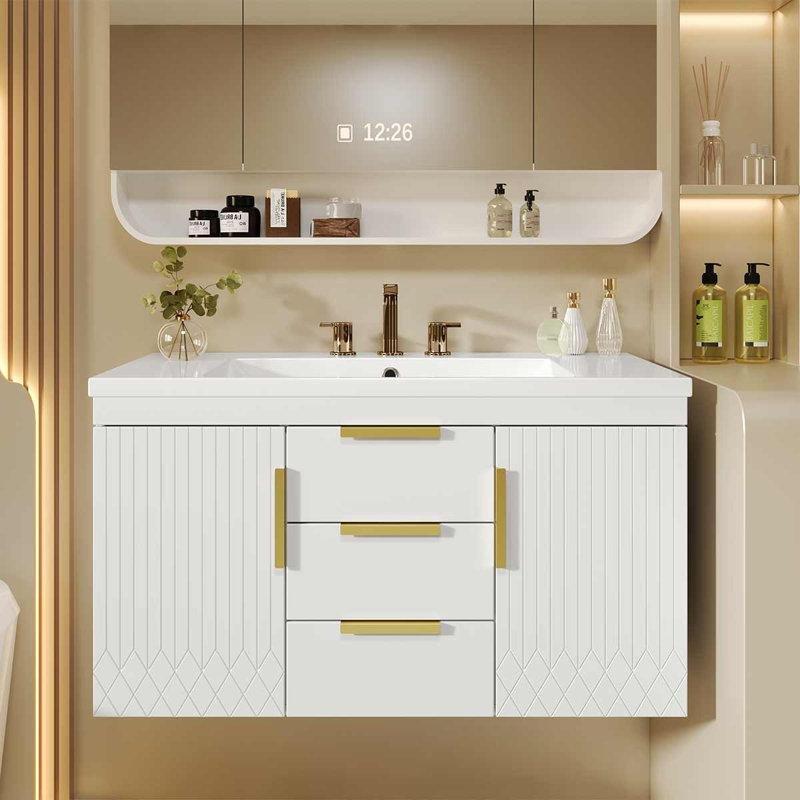 • Siyah dolap yüzeyini tamamlayan zarif gold metal kulplar, banyo dekorasyonunuza modern ve lüks bir dokunuş ekler.