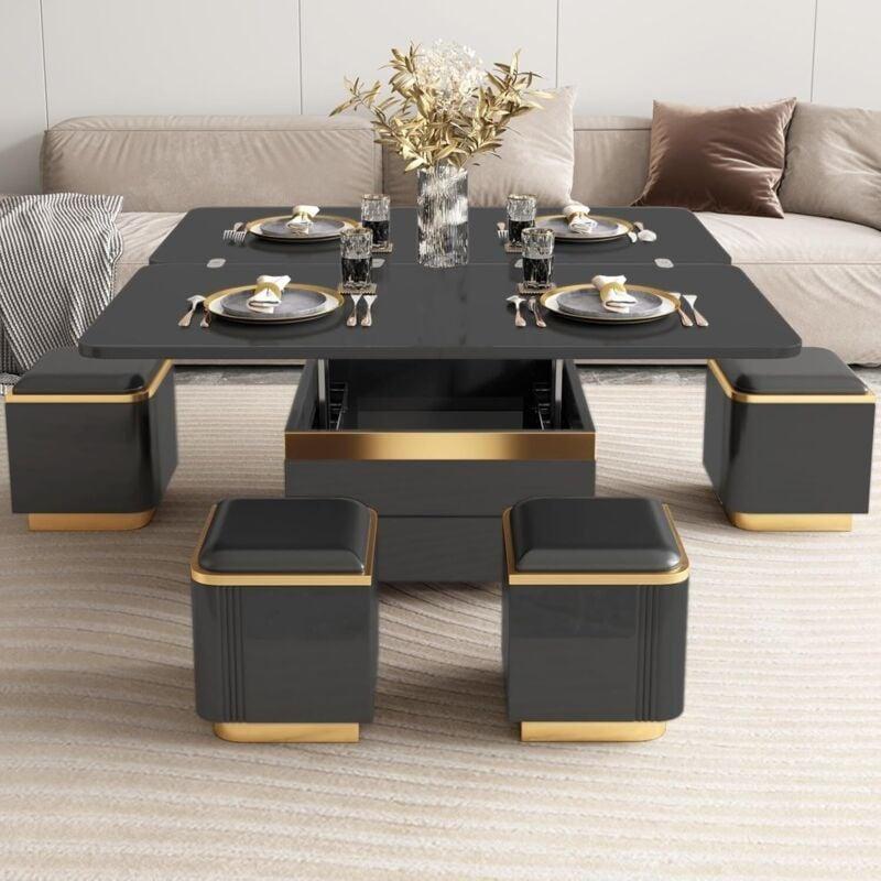 Bu sehpa, yüksekliği ayarlanabilen metal ayaklar sayesinde hem sehpa hem de yemek masası olarak kullanılabilir. Seramik görünümlü siyah MDF plateau üzerine sahiptir. Ürün, alçak konumda 39 cm yüksekliğinde sehpa olarak, yüksek konumda ise 77 cm yüksekliğinde yemek masası olarak çalışır.