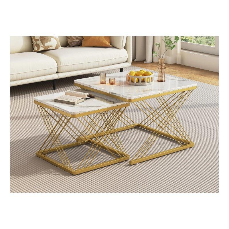 Bu üçlü zigon sehpa takımı siyah mermer desenli tablası ve gold metal ayaklarıyla dikkat çekici bir tasarıma sahiptir. Üç farklı boyutta üst üste yerleştirilebilen sehpalar, ihtiyaca göre ayrı ayrı veya bir arada kullanılabilir.
