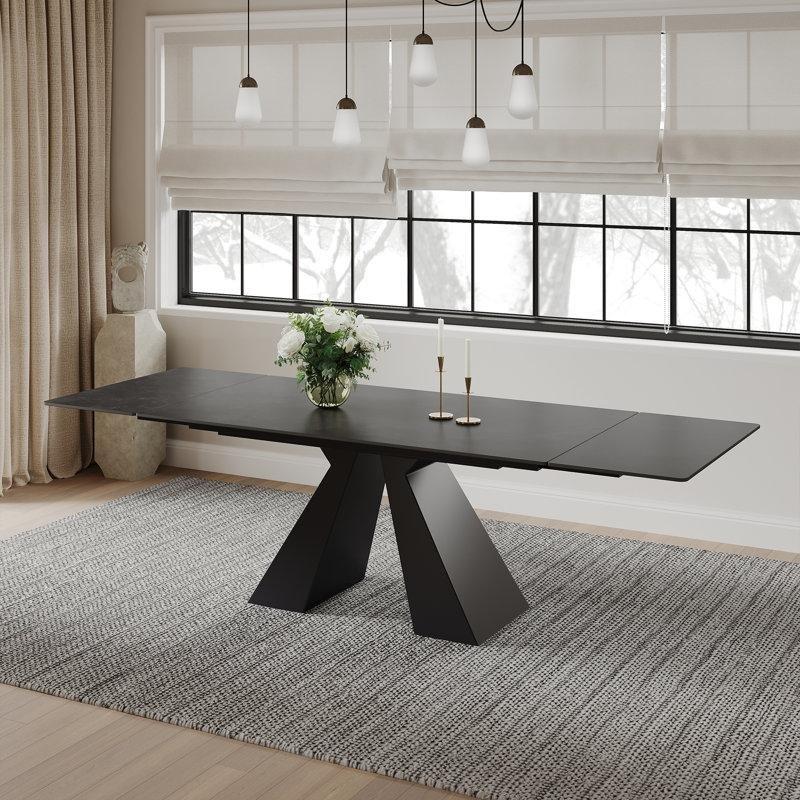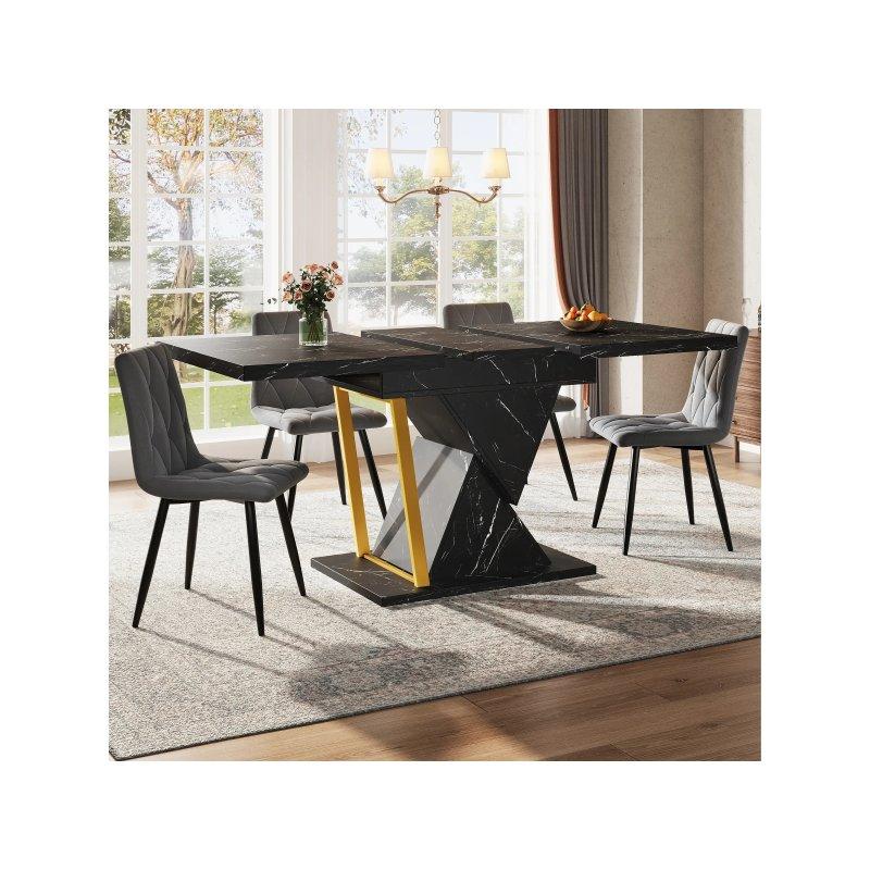 Sinterli taş malzemenin kullanıldığı bu açılır yemek masası, modern ve şık bir tasarıma sahiptir. Masanın yüzeyi siyah mermer görünümlü, pürüzsüz ve parlak bir dokuya sahiptir. Bu parlak yüzey, ışığı yansıtarak ortama zarafet ve derinlik katmaktadır. Siyah renginin mat görünümlü çelik ayaklar ile birleşimi, tasarımda güçlü bir kontrast oluşturmaktadır.
