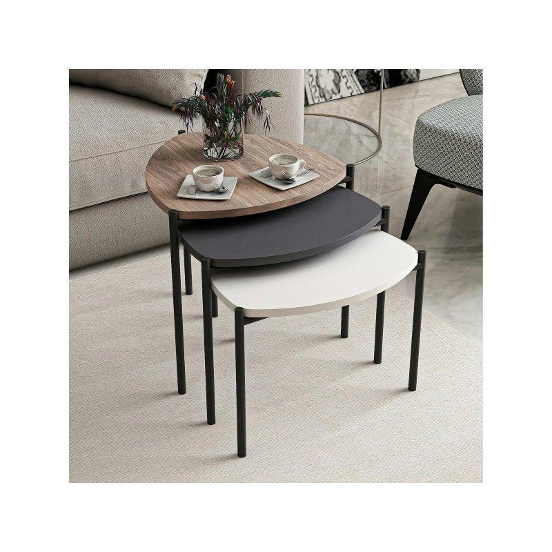 Bu yuvarlak zigon sehpa siyah meşe rengiyle zarif bir tasarıma sahiptir. Modern tarzı ve mat yüzey dokusuyla hem salon hem de çalışma alanları için uygundur. Üç parçadan oluşan sehpa takımı istiflenebilir yapısıyla pratik kullanım sağlar.