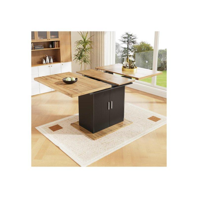 Siyah metal ayaklara sahip bu açılır yemek masası, modern ve işlevsel bir tasarıma sahiptir. Masanın üst yüzeyi, sıcak ve doğal tonları ile odaya sıcaklık katan ahşap malzemeyle kaplıdır. Ahşap yüzey mat ve pürüzsüz bir dokuya sahip olup, günlük kullanımda kolayca temizlenebilir.