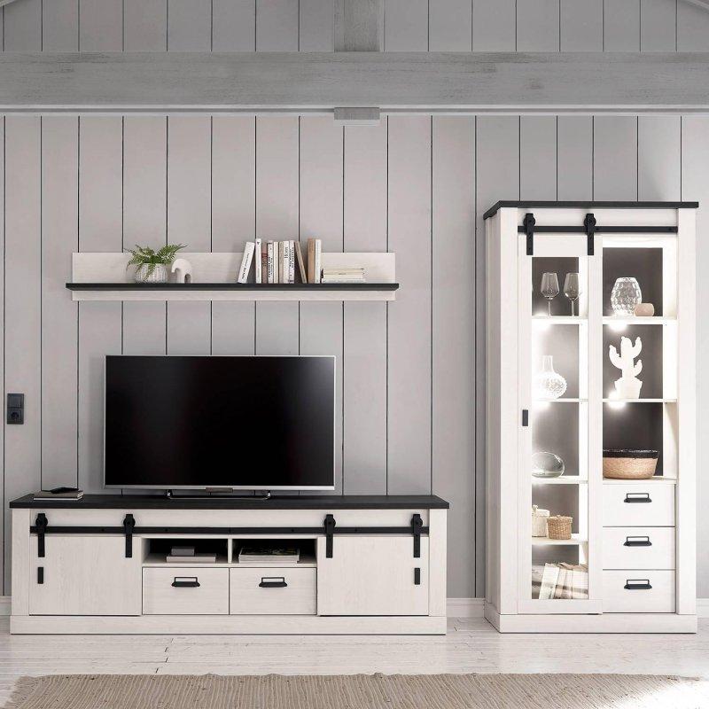 – Üç ayrı bölümden oluşur: duvar rafı, lowboard ve cam kapılı vitrin