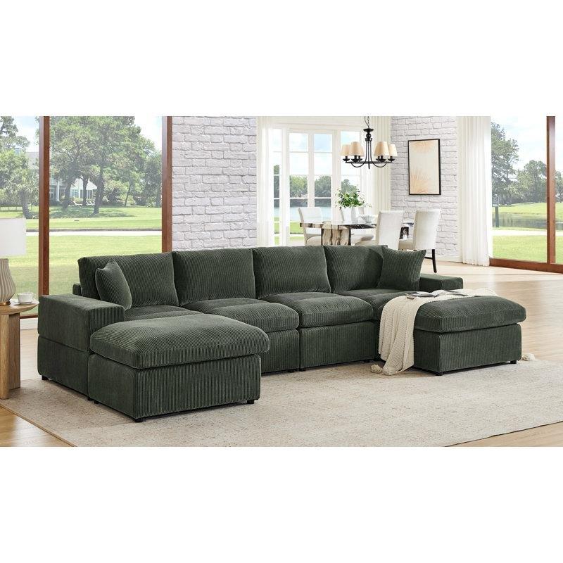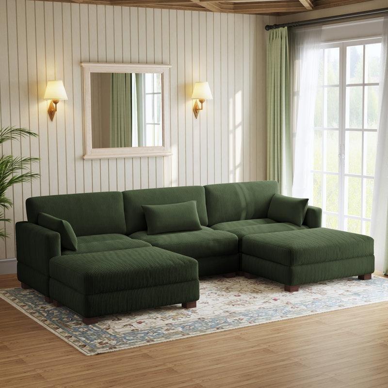 • Bu köşe koltuk takımı, modüler yapısı sayesinde U şeklinde düzenlenebilir ve yaşam alanınıza esneklik katar. Yeşil renkli, dokulu fitilli kadife kumaş kaplaması ile mekanınıza canlılık ve derinlik kazandırır.