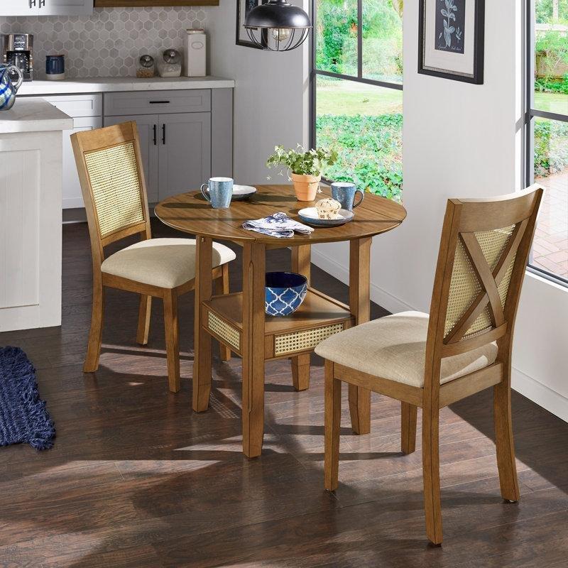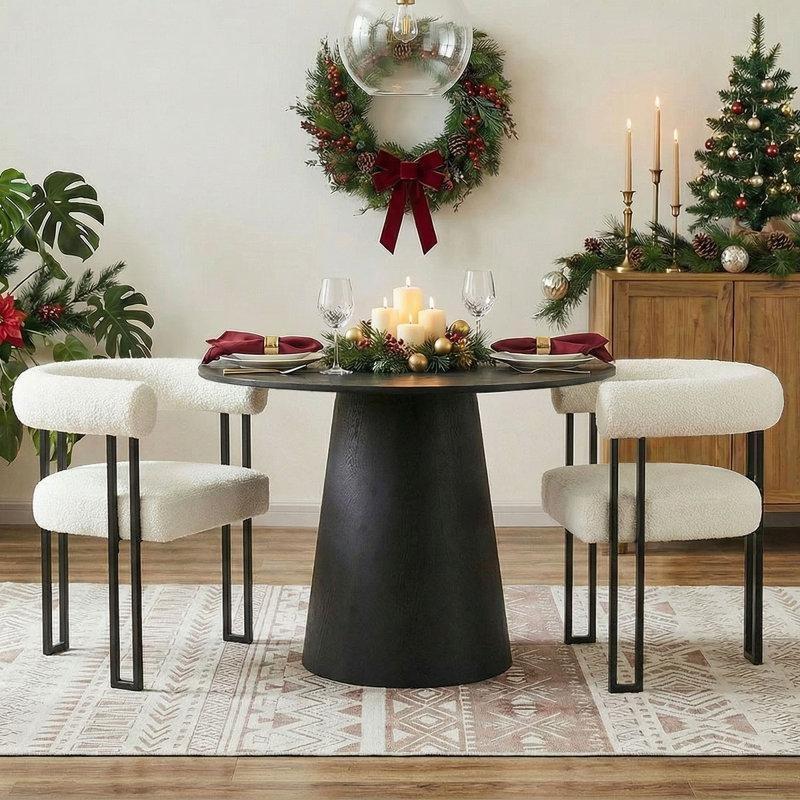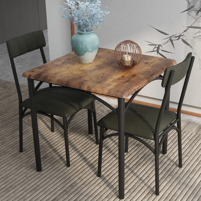 Bu üç parçalı yemek seti küçük mekanlar için tasarlanmıştır. Seti oluşturan yuvarlak masa endüstriyel ahşap malzeme ile yapılmıştır ve siyah metal ayakları ile modern bir tasarıma sahiptir. Masanın yüzeyi pürüzsüz ve mat bir doku sunmaktadır. Tablasının kalınlığı 1,5 cm olup oldukça sağlamdır.