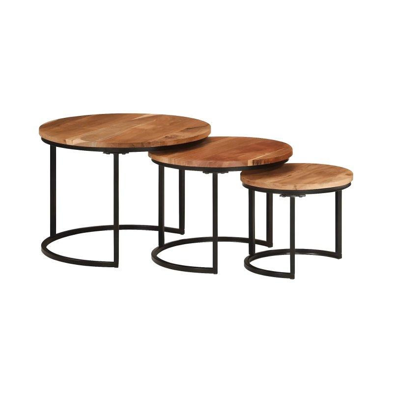 Bu üçlü zigon sehpa seti, masif akasya ahşap ve siyah metal ayaklardan oluşur. Doğal ahşap renkte vernikli akasya masiften üretilmiş tablalar, sağlam ve uzun süreli kullanıma uygundur. Akasya ahşabı sert ve dayanıklı bir tropikal ahşap türüdür. Siyah toz boya kaplı metal ayaklar, modern bir görünüm sağlar ve ahşap tablayı dengeli şekilde taşır.