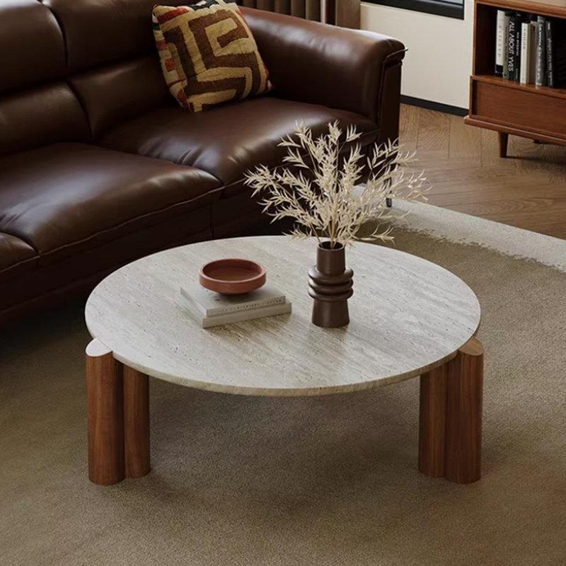 Bu yuvarlak orta sehpa, tasarımıyla mekanınıza sadelik ve şıklık getirir. Üst yüzeyi doğal mermer malzemeden yapılmış olup, pürüzsüz ve soğuk bir dokuya sahiptir. Masif akasya ağacından üretilen ayakları ise sağlam bir yapı sunar ve ürünün genel dayanıklılığını artırır.